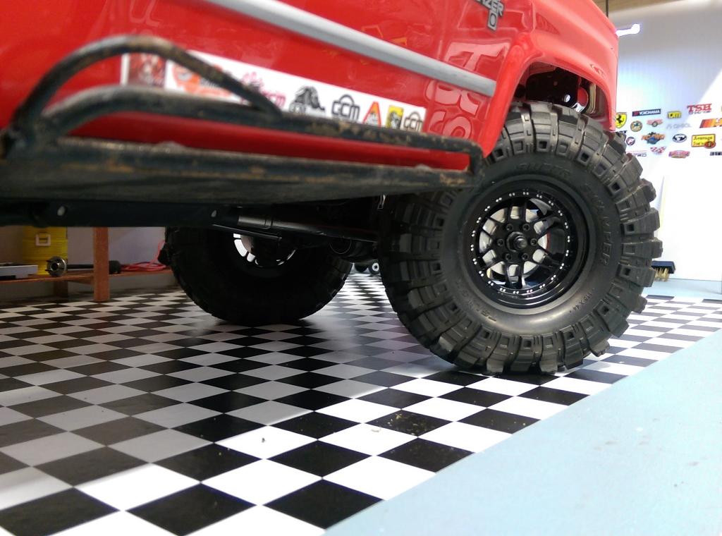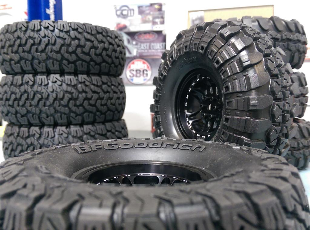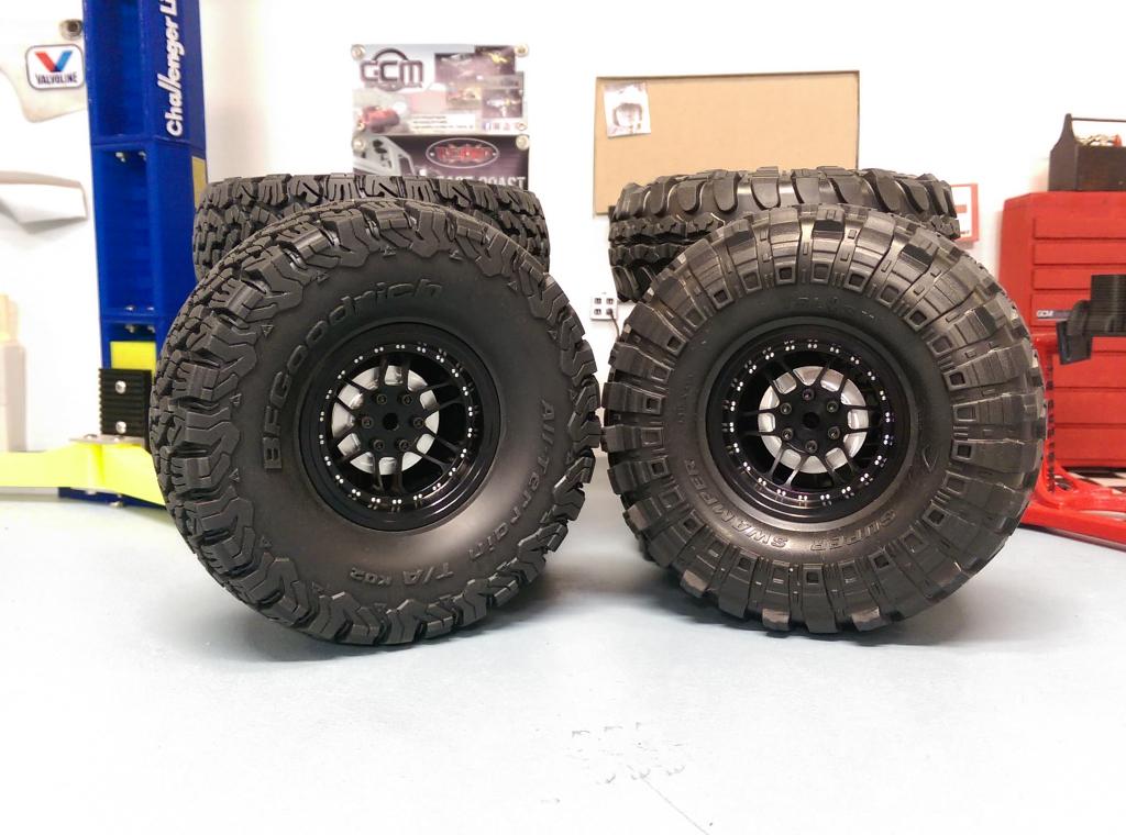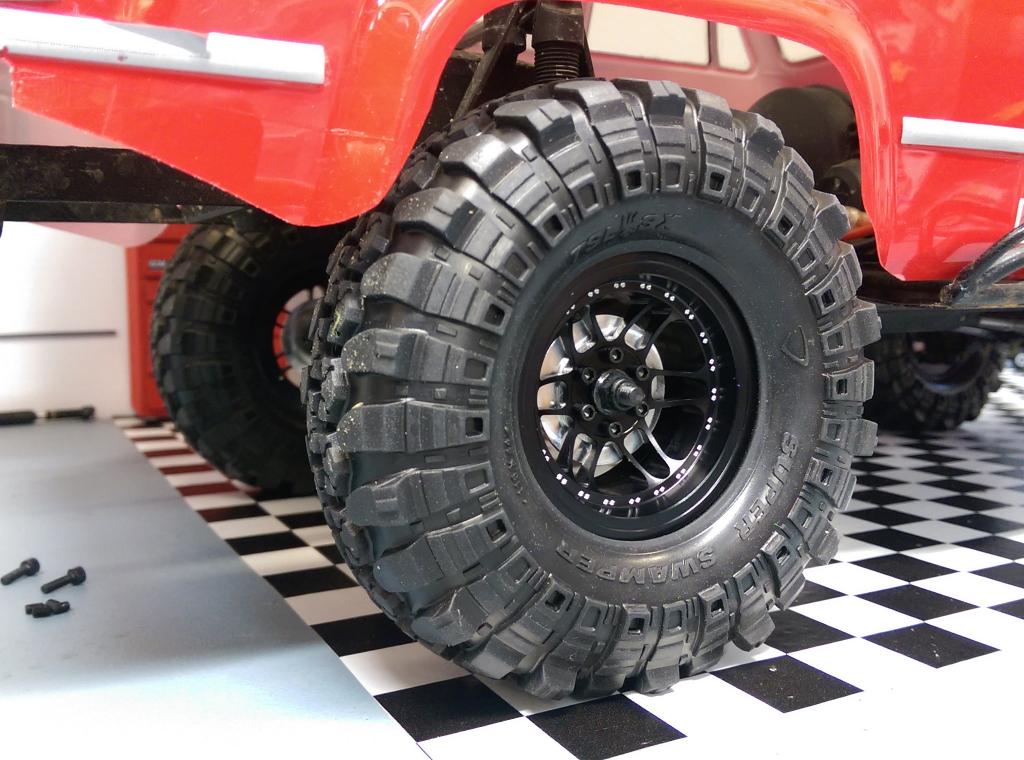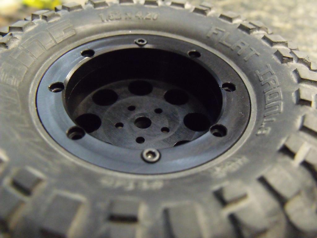 These are a 12 spoke rim finished in Black Anodize, then decorated with beadlock bolt patterns around the inner lip. Using 6 studs on the hex covering rotor, and 6 bolts from the back ring to lock the tire, the assembly is simple and the look is really clean.
