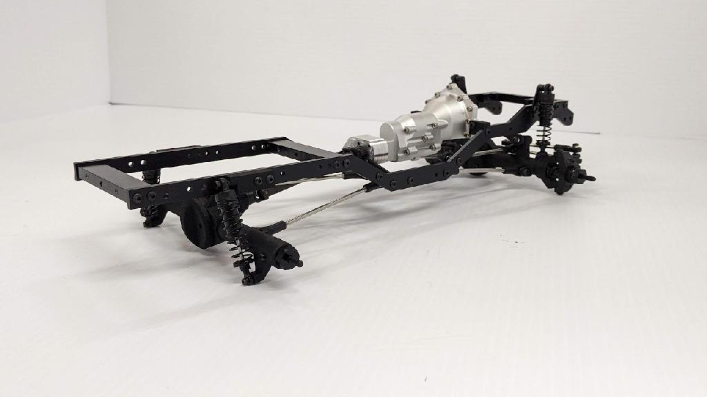 The DELTΔ includes a machined aluminum servo mount, 2 cross drilled crossmembers, great for bumper mounting, nylon center skidplate, machined adjustable front shock towers, 4 coil over oil filled shocks, rear nylon shock mounts, and a 50.5:1 final drive ratio. The scale trans, pinion gear, and small 11% front overdrive are all included and built in to the kit.